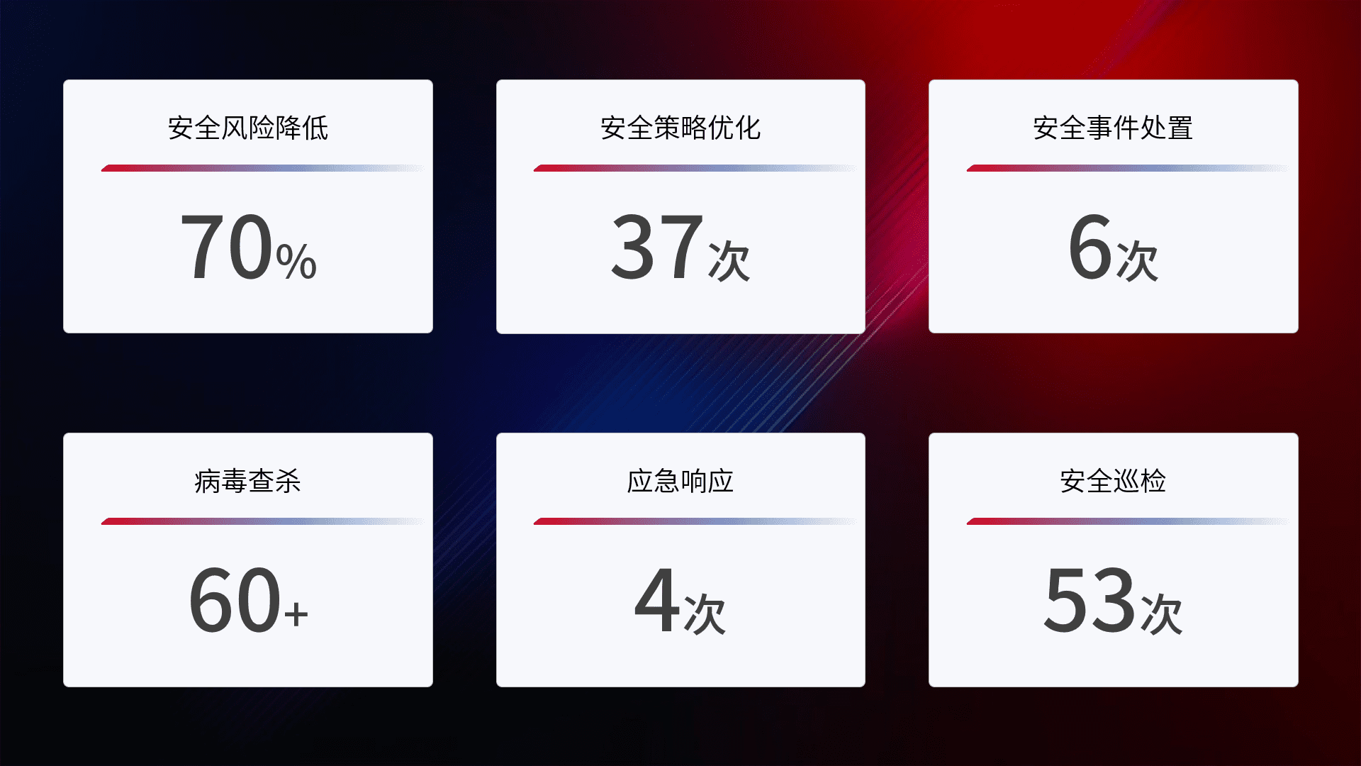 提供全面的安全事件报告体系,,,,包括处置报告、、、、周报、、季度和年度总结,,,,结合持续监控,,,帮助客户深入了解网络安全状况。。。。